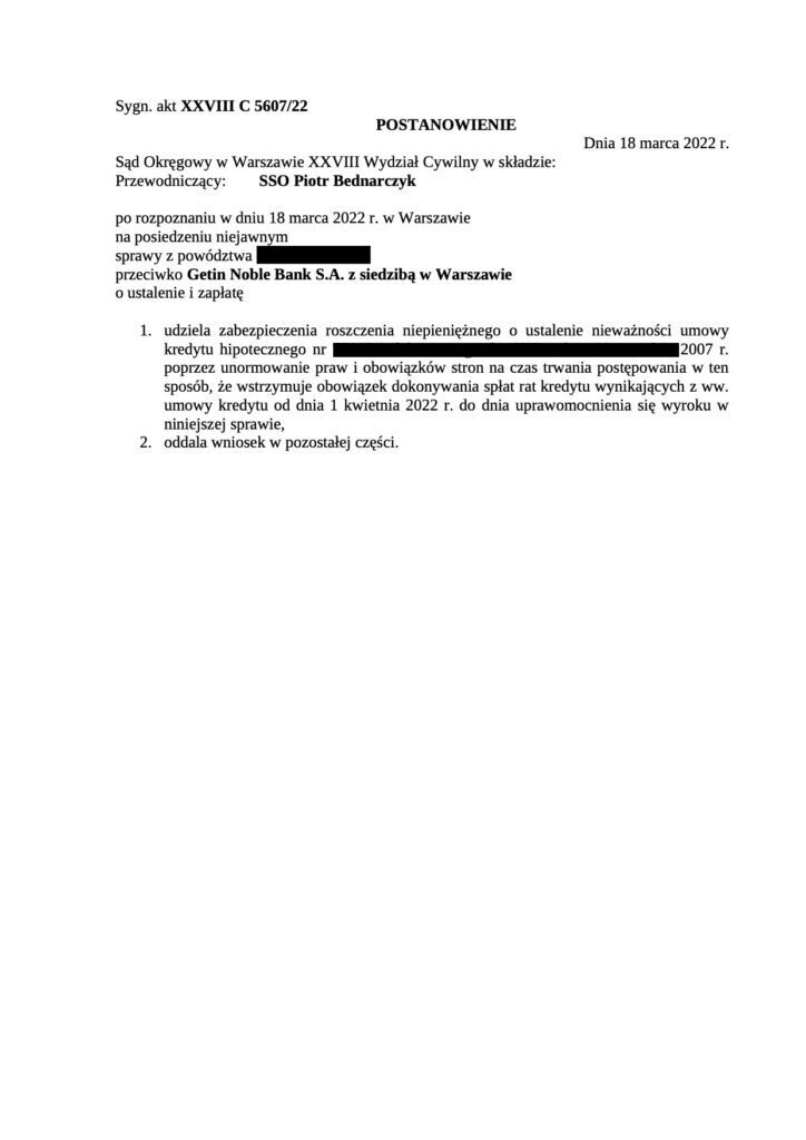 W w/w postanowieniem Sąd udzielił zabezpieczenia naszemu klientowi wstrzymując płatność dalszych rat kredytu za okres od 1.04.2022r. do czasu uprawomocnienia się wyroku. Sąd oddalił wniosek w pozostałej części, czyli za okres przed 1.04.2022r. Oczywiście ma to sens, ponieważ klient i tak zobowiązany był do płacenia rat, aż do uzyskania zabezpieczenia.