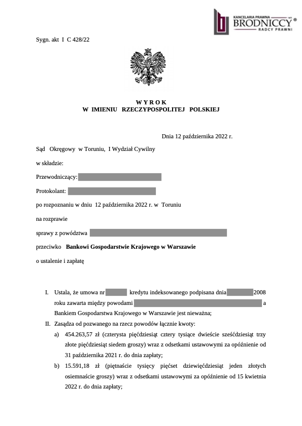 Dnia 12 października 2022 r. (po zaledwie 8 miesiącach od złożenia pozwu!) Sąd Okręgowy w Toruniu w sprawie o sygn. IC 428/22, na rozprawie zdalnej rozpoznał sprawę z powództwa naszych Klientów przeciwko Bankowi Gospodarstwa Krajowego (tak, ten bank również udzielał kredytów „frankowych”) i po przesłuchaniu powodów od razu wydał wyrok, w którym: