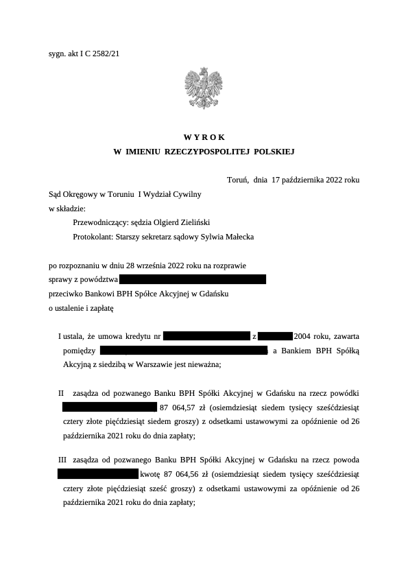 Dnia 17 października 2022 r. Sąd Okręgowy w Toruniu w sprawie o sygn. IC 2582/21, na rozprawie zdalnej rozpoznał sprawę z powództwa naszych Klientów przeciwko BPH i wydał wyrok: